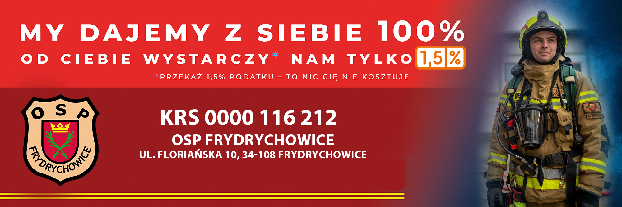 Interwencje Aktualności Manewry MDP 1,5% Podatku na rzecz OSP Zatrzymaj się. Zareaguj. Pomóż! Nasz najnowszy film pokazuje, jak wielką siłę ma najmniejszy gest. W sytuacjach kryzysowych to właśnie reakcja zwykłych ludzi ratuje życie. Nie przechodź obojętnie. Nie bój się pomóc. Bądź tym, kto robi różnicę. STATYSTYKI WYJAZDÓW OSP FRYDRYCHOWICE W 2026 ROKU* Wyjazd dwoma samochodami 557K23 GBA Renault D16 557K24 GLBARt VW Crafter 0 POŻARY - 2 67% MIEJSCOWE ZAGROŻENIA - 1 33% ALARMY FAŁSZYWE - 0 0% *Stan na dzień 25.03.2026 NASI PARTNERZY