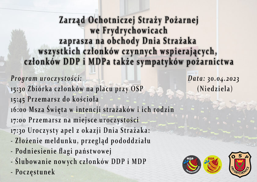Serdecznie zapraszamy na obchody Dnia Strażaka w OSP Frydrychowice wszystkich członków OSP a także DDP i MDP. Podczas uroczystości ślubowanie złożą nowi członkowie Dziecięcej i Młodzieżowej Drużyny Pożarniczej.