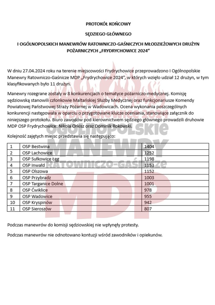 Wyniki I Ogólnopolskich Manewrów Ratowniczo-Gaśniczych MDP - Frydrychowice 2024