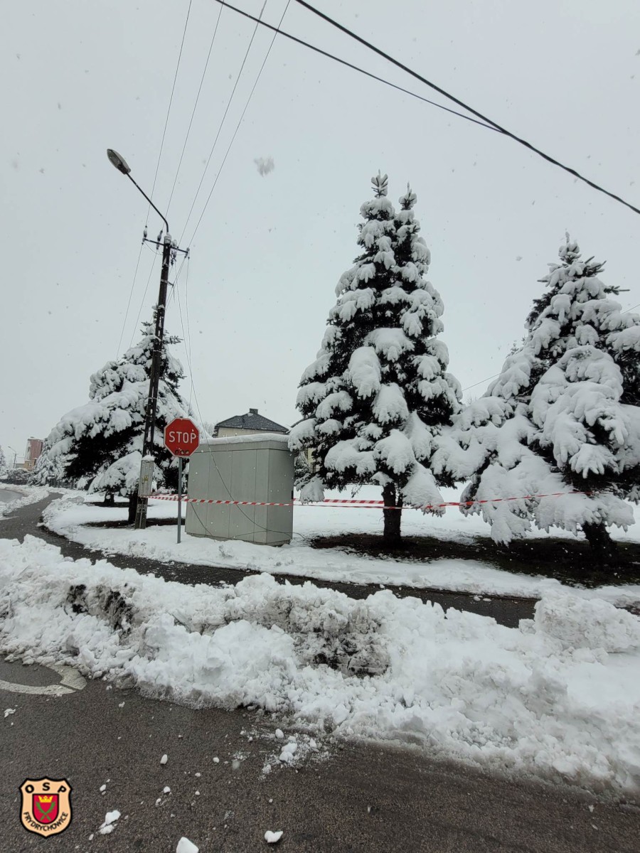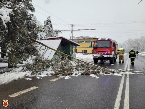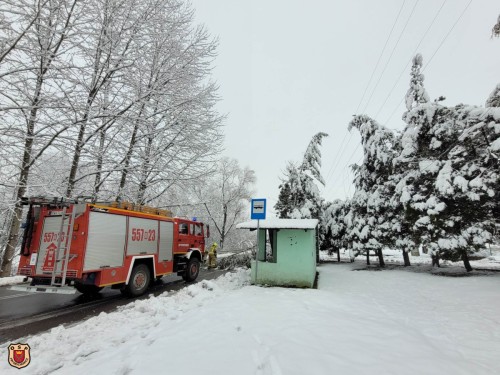 Podczas pakowania sprzętu do samochodów druhowie usłyszeli huk i zobaczyli, że w rejonie zerwanych kabli na ulicę spadł konar. Niezwłocznie udaliśmy się w to miejsce. Nasze działania polegały na pocięciu drewna i uprzątnięciu jezdni oraz oznakowaniu miejsca gdzie leżały kable. O całym zdarzeniu poinformowana została również energetyka.