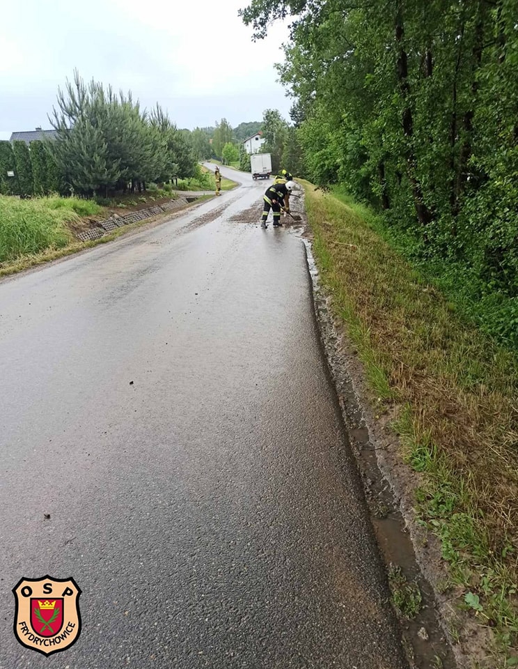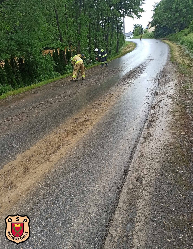 Po dojeździe zastepu potwierdzono treść zgłoszenia, zabezpieczono miejsce oraz usunięto naniesiony żwir oraz błotoz pobocza po intensywnych opadach deszczu jakie przeszły przez nasz powiat.