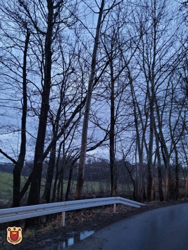 Informacja o zdarzeniu: Pochylone drzewo nad drogą, podmyte przez rzekę opiera się o inne drzewo.