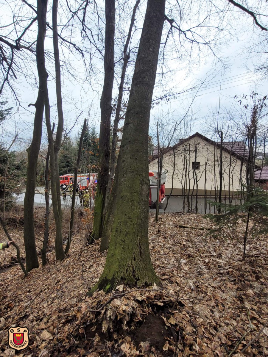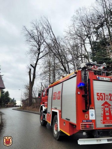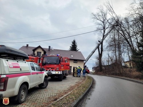 Po dojeździe na miejsce naszego zastępu potwierdzono treść zgłoszenia, na miejsce zadysponowano również dwa zastępy z JRG Andrychów a także pogotowie energetyczne. Po odłączeniu zasilania w przebiegającej wzdłuż jezdni linii energetycznej przystąpiono do działań. Nachylone drzewo cięte było po kawałku tak aby spadające gałęzie nie uszkodziły linii.