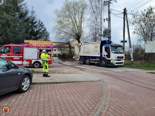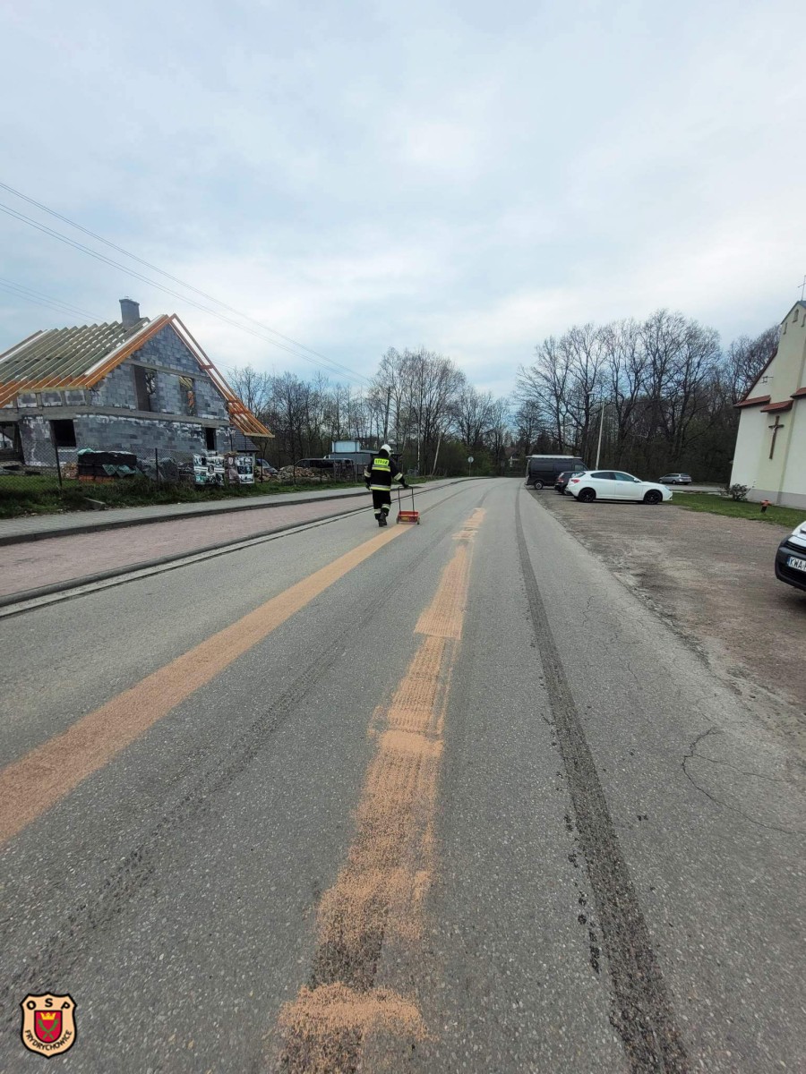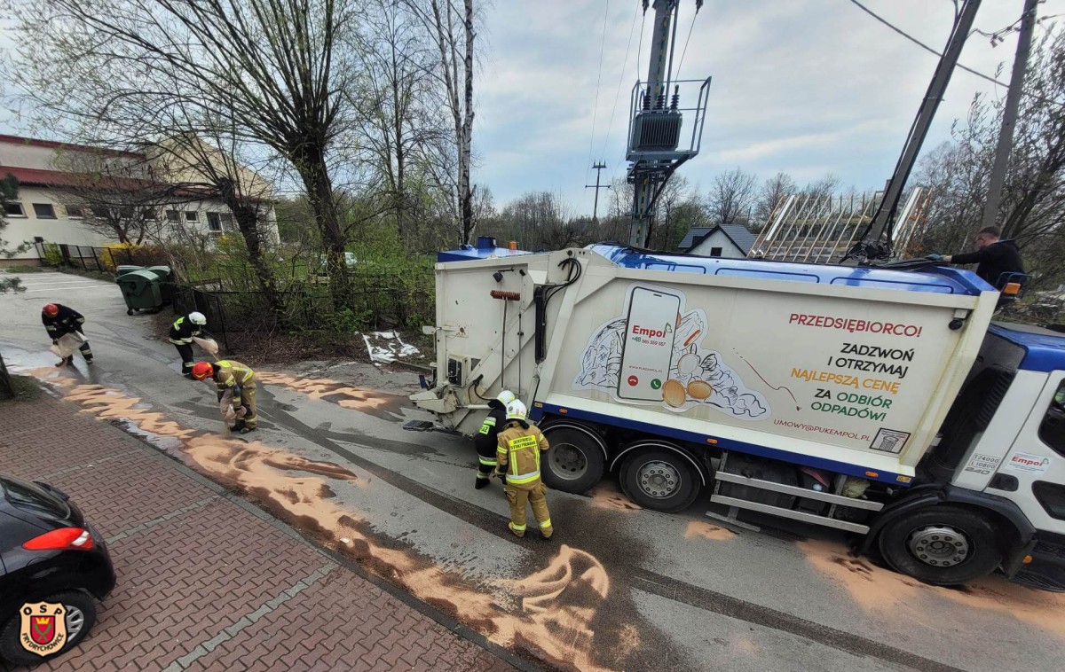 Po dotarciu na miejsce okazało się, że w śmieciarce doszło do pęknięcia przewodu z olejem hydraulicznym, który rozlał się na parking oraz drogę powodując zagrożenie dla uczestników ruchu.