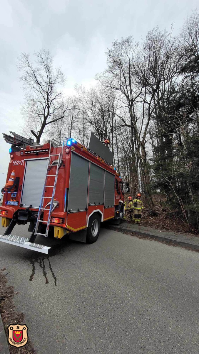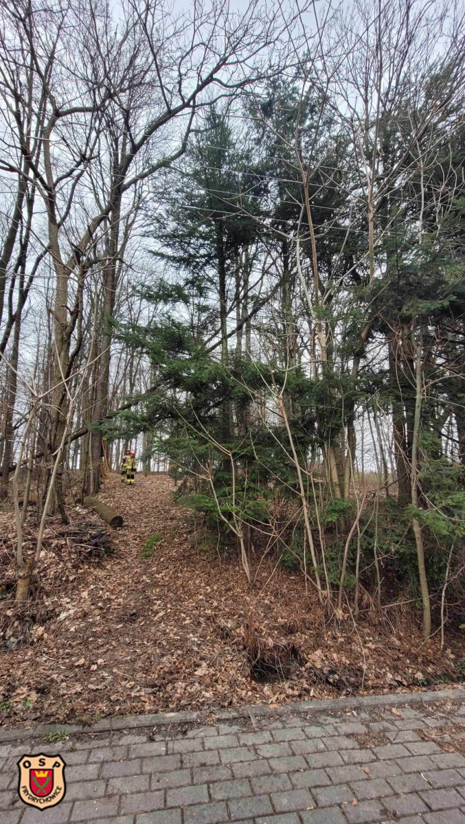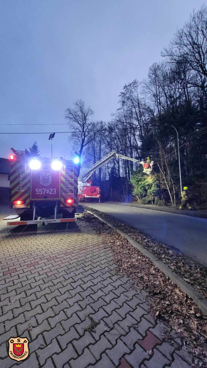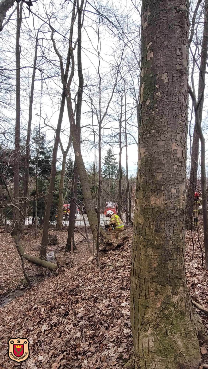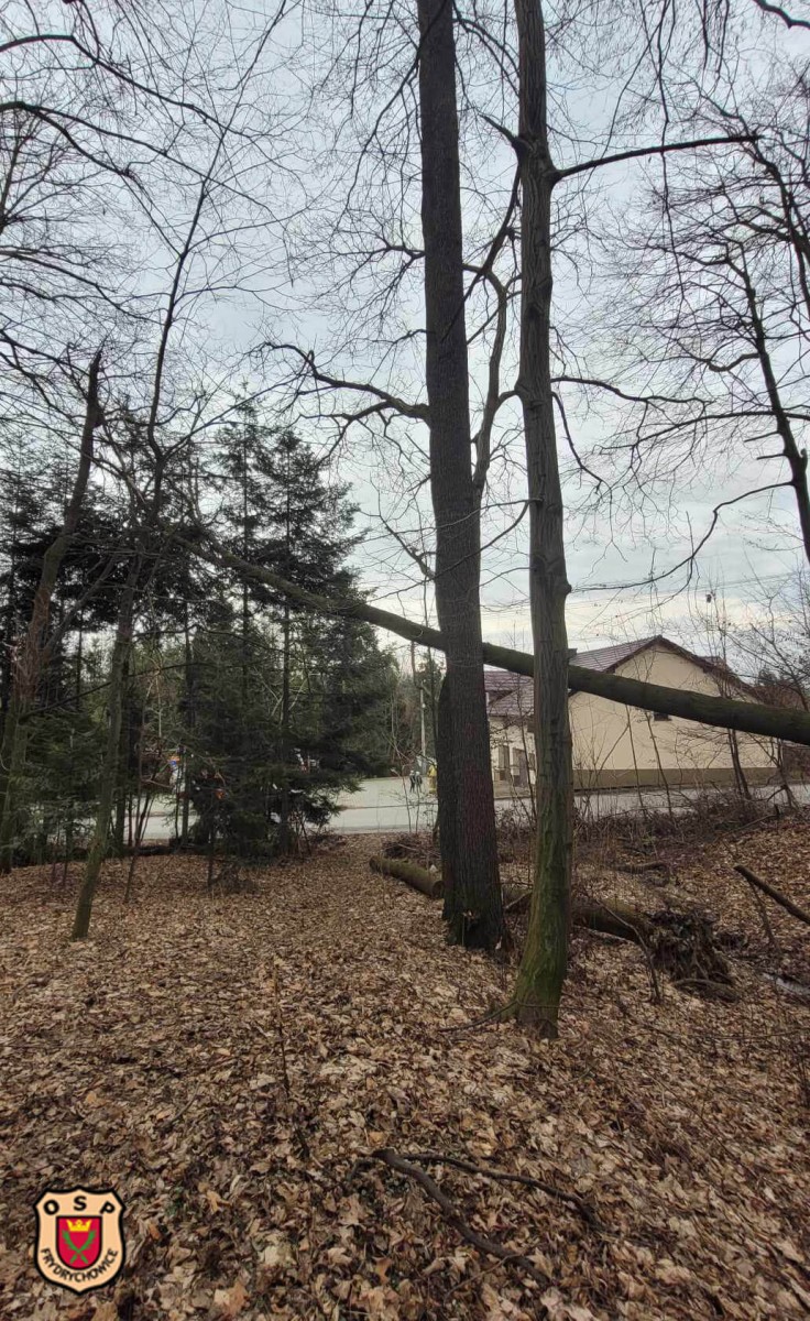 W „buczynie” dwa drzewa wyrwane z korzeniami oparły się o kolejne dwa stwarzając zagrożenie upadku na jezdnię, chodnik oraz napowietrzną linię niskiego napięcia.